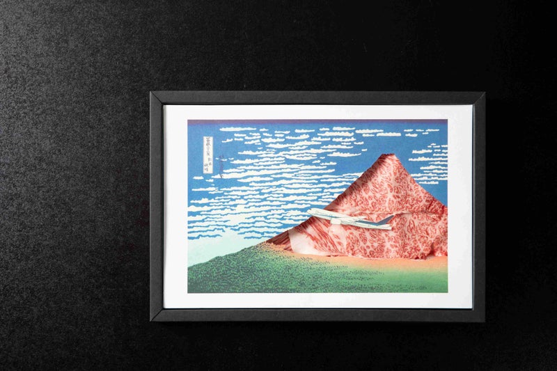 「味わえる芸術を贈る」をコンセプトに生まれたArt Beef Galleryは、日本三大和牛を味わえる品です。 美しく、そして美味しいひとときを贈ることができます。 江戸時代後期の浮世絵師 葛飾北斎の富士図鑑 画集 『富嶽三十六景』全46図中の1図で別名「赤富士」と、最高級の近江牛をコラボしました。 A5ランクの近江牛肩ロースには適度なサシが入っており、赤富士にある雪を表現するのに適しています。 鱗雲が浮かぶ快晴の空に、山肌が夏の暁で赤く染まった富士山を近江牛で表現しました。